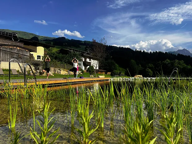 genießen Sie Yoga während Ihres Aufenthalts bei uns! Bei schönem Wetter laden wir Sie herzlich ein, unsere Yoga-Sessions am idyllischen Teich im Garten zu besuchen. Die ruhige Umgebung und die frische Luft bieten den perfekten Rahmen für Ihre Praxis.